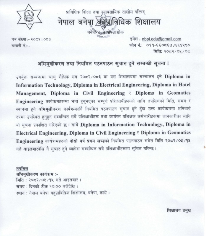अभिमुखिकरण तथा नियमित पठनपाठन हुने सम्बन्धी सूचना।