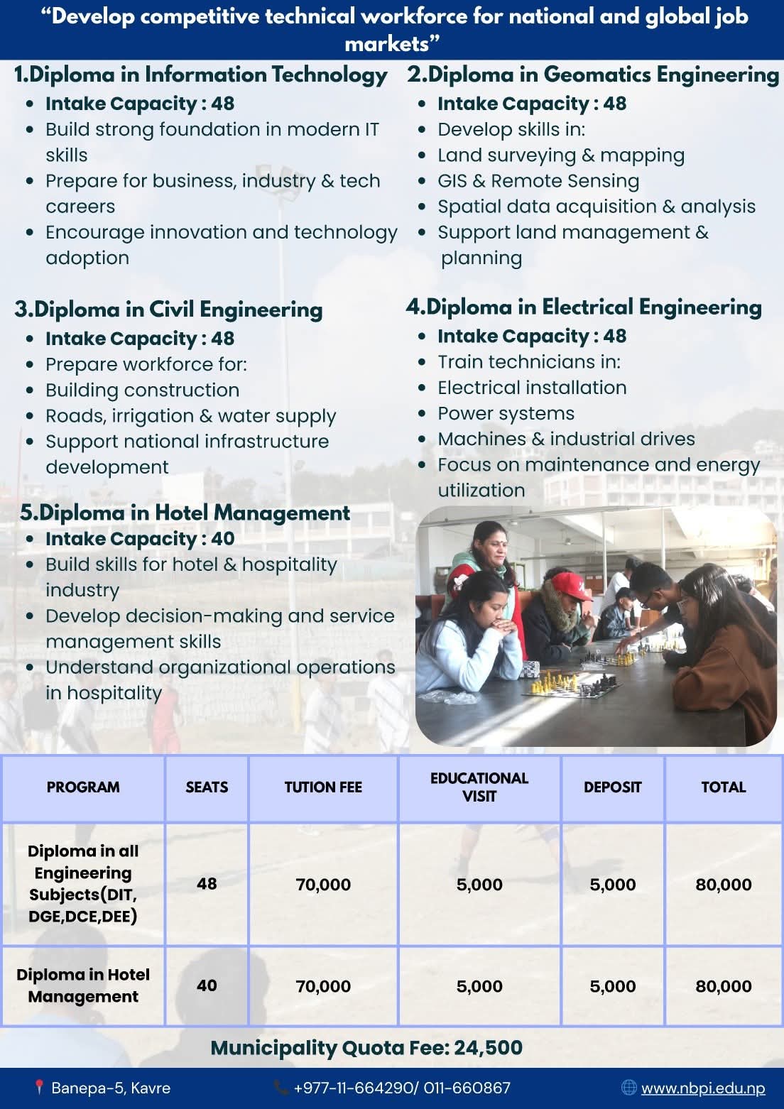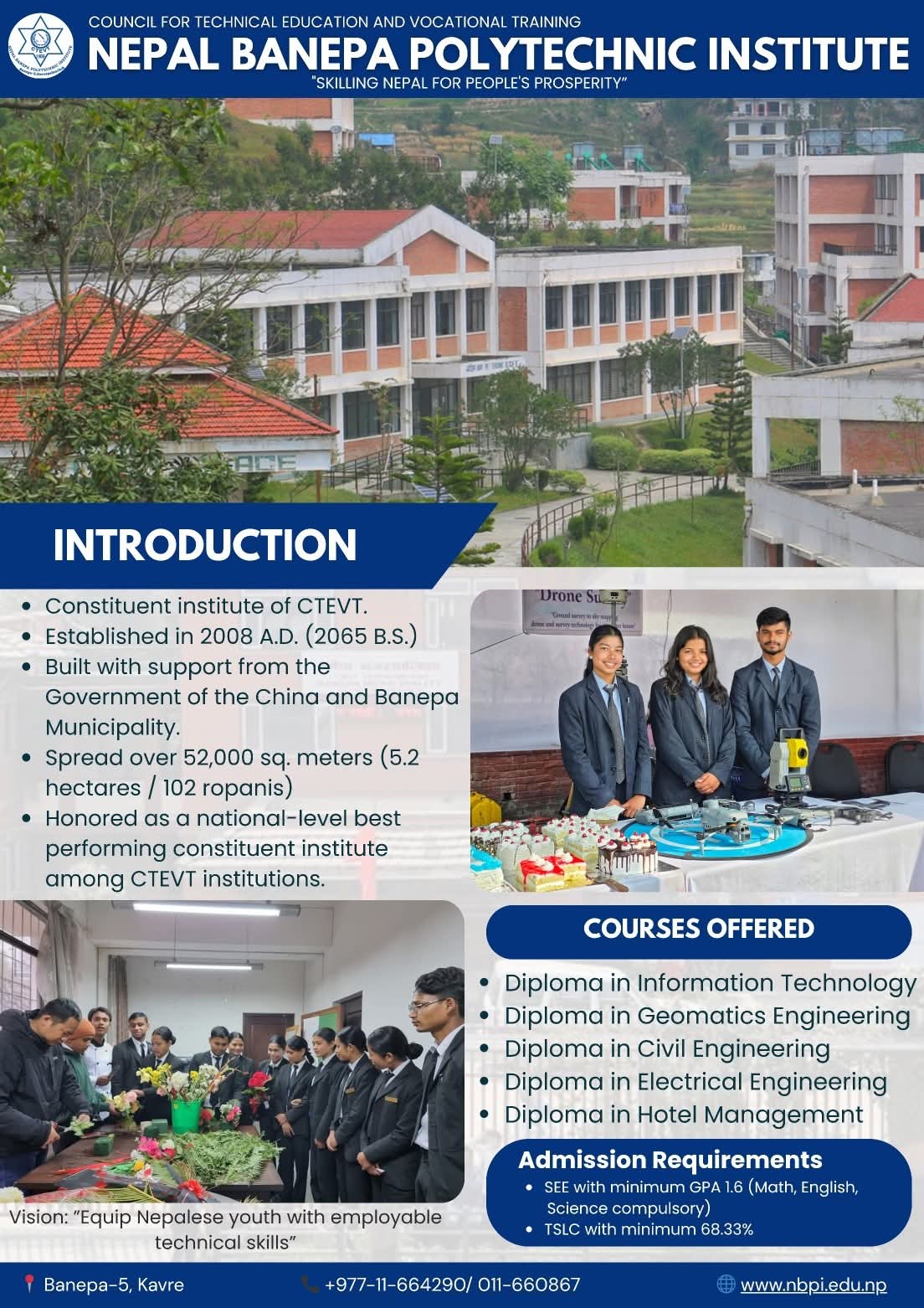 About NBPI Nepal Banepa Polytechnic Institute (NBPI) is one of the constituent institutes of the Council for Technical Education and Vocational Training (CTEVT). NBPI was established in 2008 A.D. (2065 B.S.) in Banepa Municipality -5, Banepa, Kavrepalanchok district. It was built under the aid of government of People’s Republic of China. It occupies the area … Continue reading About Us
