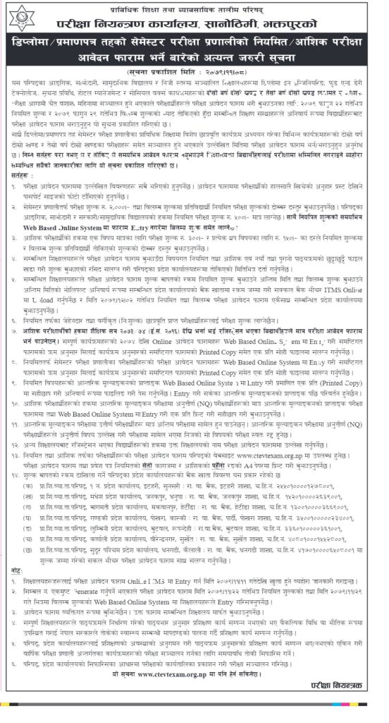 डिप्लोमा / प्रमाणपत्र तहको सेमेस्टर परीक्षा प्रणालीको नियमित / आंशिक परीक्षा आवेदन फारम भर्ने बारेको अत्यन्त जरुरी सूचना