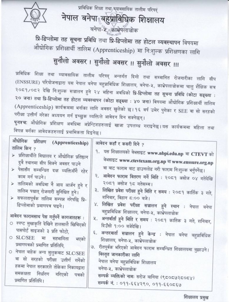NBPI⟩⟩Uncategorized⟩⟩प्रि-डिप्लोमा तह सूचना प्रविधि तथा प्रि-डिप्लोमा तह होटेल व्यवस्थापन बिषयमा Apperenticeship मा निशुल्क प्रशिक्षणका लागि आवेदन सम्बन्धि सूचना।।।