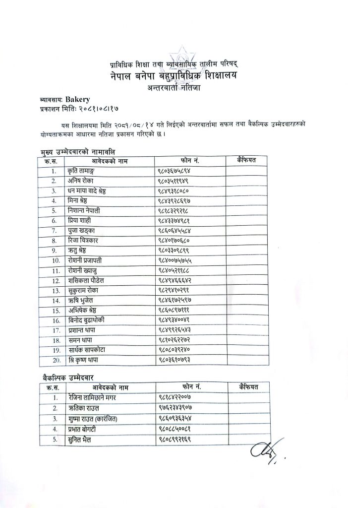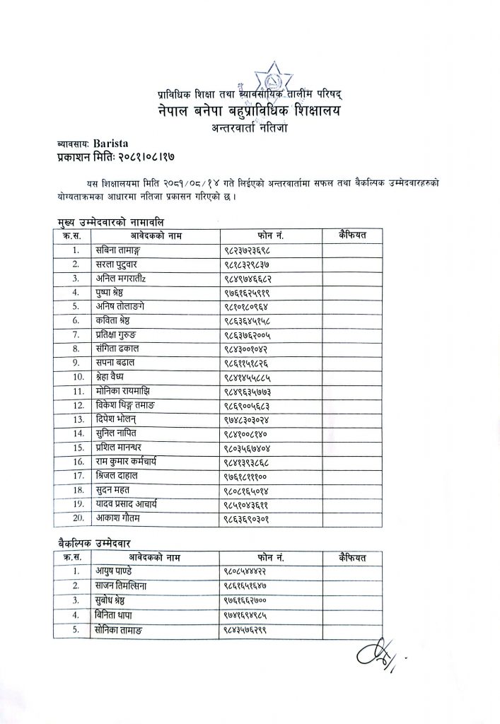 NBPI⟩⟩News⟩⟩छोटो अवधिको तालिम अन्तर्गत Bakery र Barista व्यावसायको लागि मिति २०८१/०८/१४ गते लिइएको अन्तर्वार्ताको नतिजा।