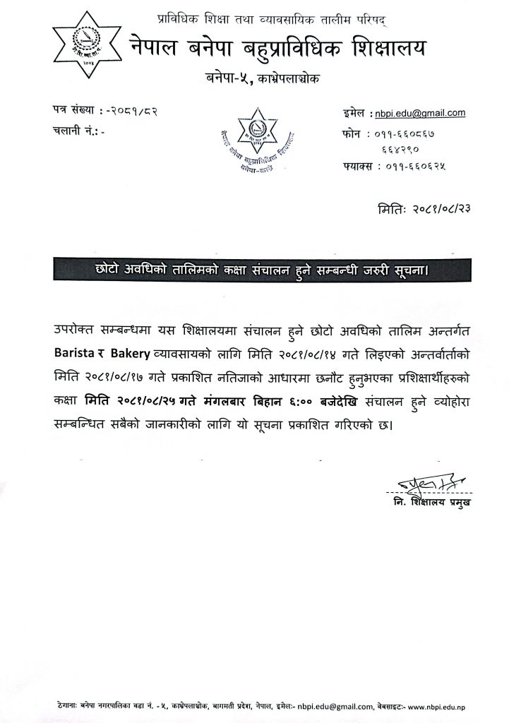 छोटो अवधिको तालिम अन्तर्गत Bakery र Barista व्यावसायको कक्षा संचालन हुने सम्बन्धी जरुरी सूचना। Posted on: December 8, 2024