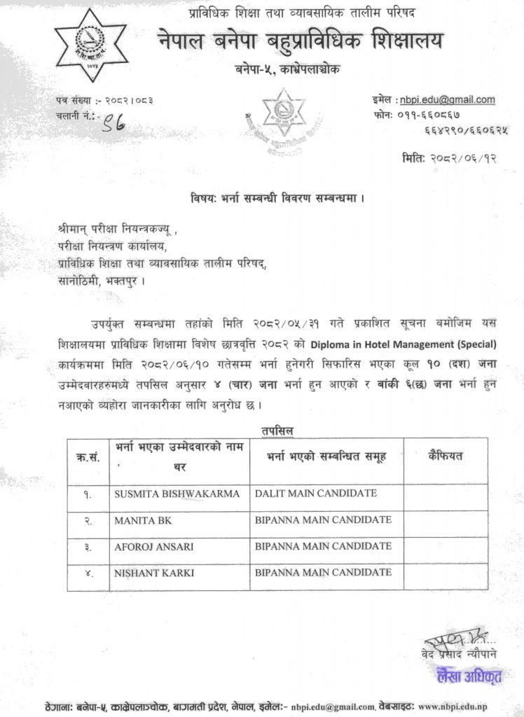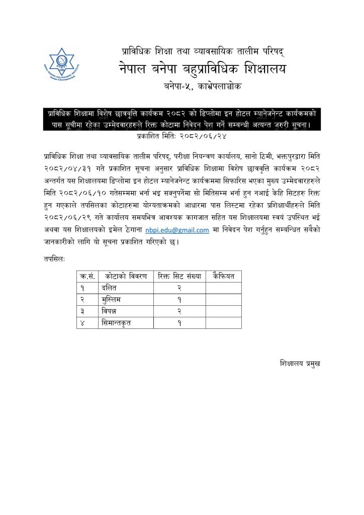 NBPI⟩⟩News⟩⟩प्राविधिक शिक्षामा विशेष छात्रवृत्ति कार्यक्रम २०८२ को डिप्लोमा इन होटल म्यानेजनेन्ट कार्यक्रममा भर्ना भएका प्रशिक्षार्थी तथा रिक्त कोटाको विवरण सम्बन्धमा।