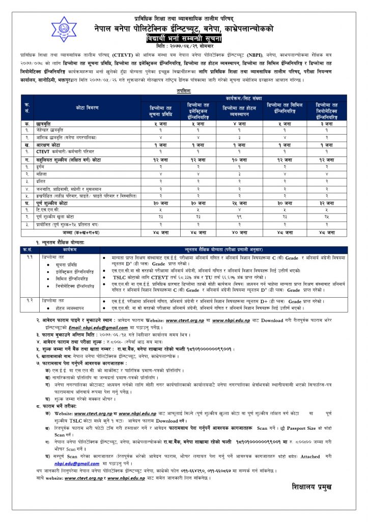 २०७७/७८ को लागि नयाँ बिद्यार्थी भर्ना सम्बन्धि सूचना Posted on: September 14, 2020 Downloads Admission notice for 2077/78Diploma Level Full fee paying-TSLC Quota formDiploma level Full fee paying-लक्षित वर्ग quota formDiploma Level Full Fee Paying-Open Quota form