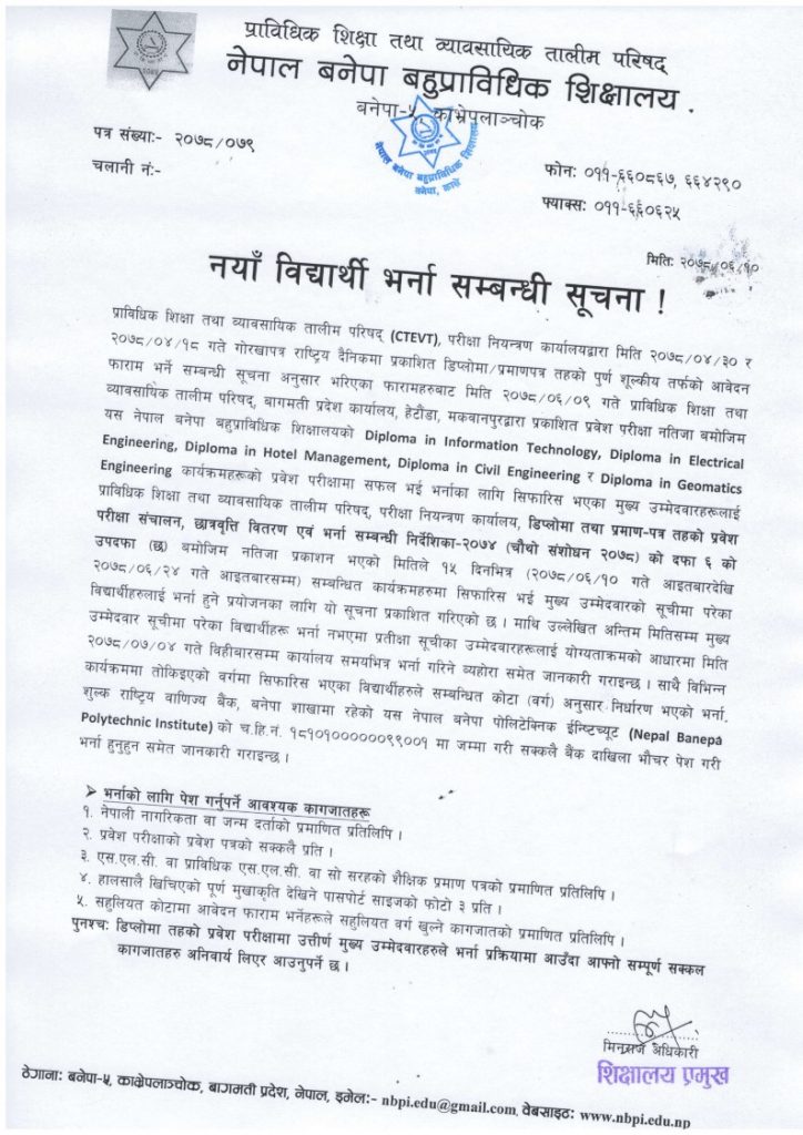 नँया विद्यार्थी भर्ना सम्बन्धी सूचना