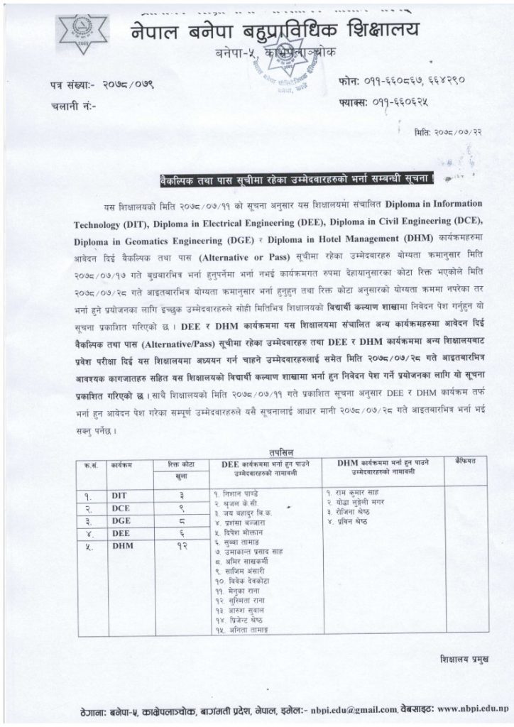 वैकल्पिक तथा पास सूचीमा रहेका उम्मेदवारहरुको भर्ना सम्बन्धी सूचना